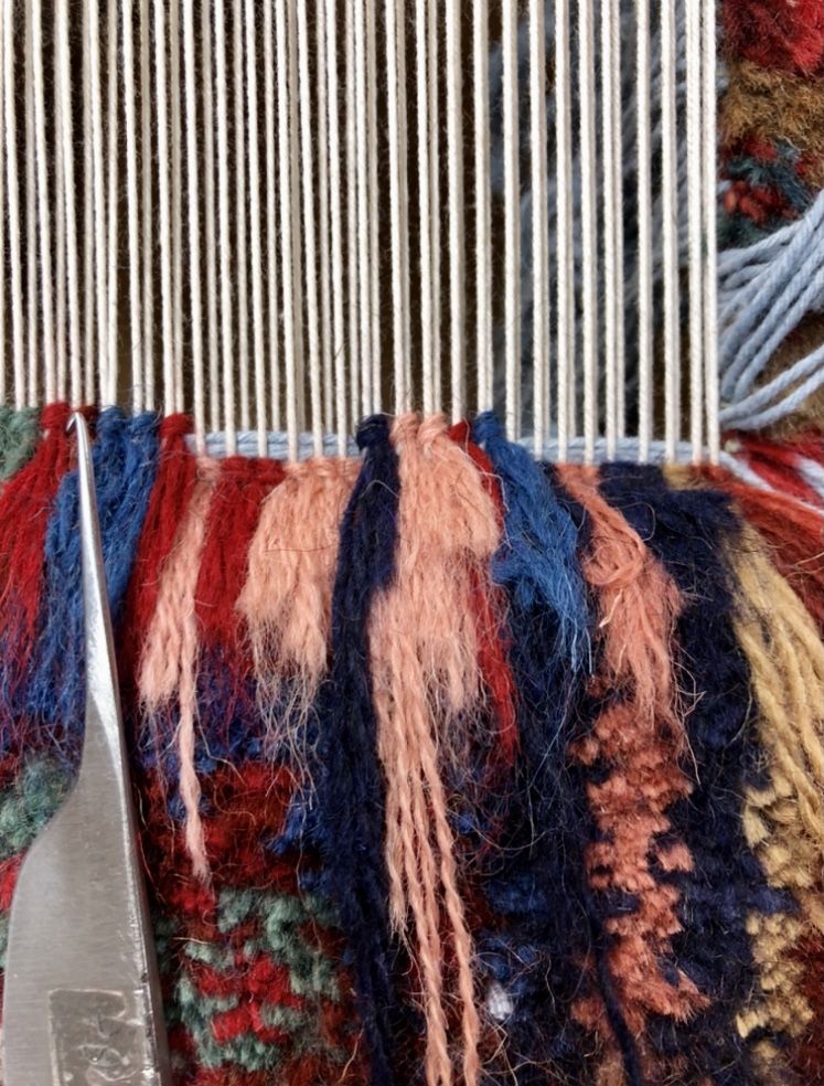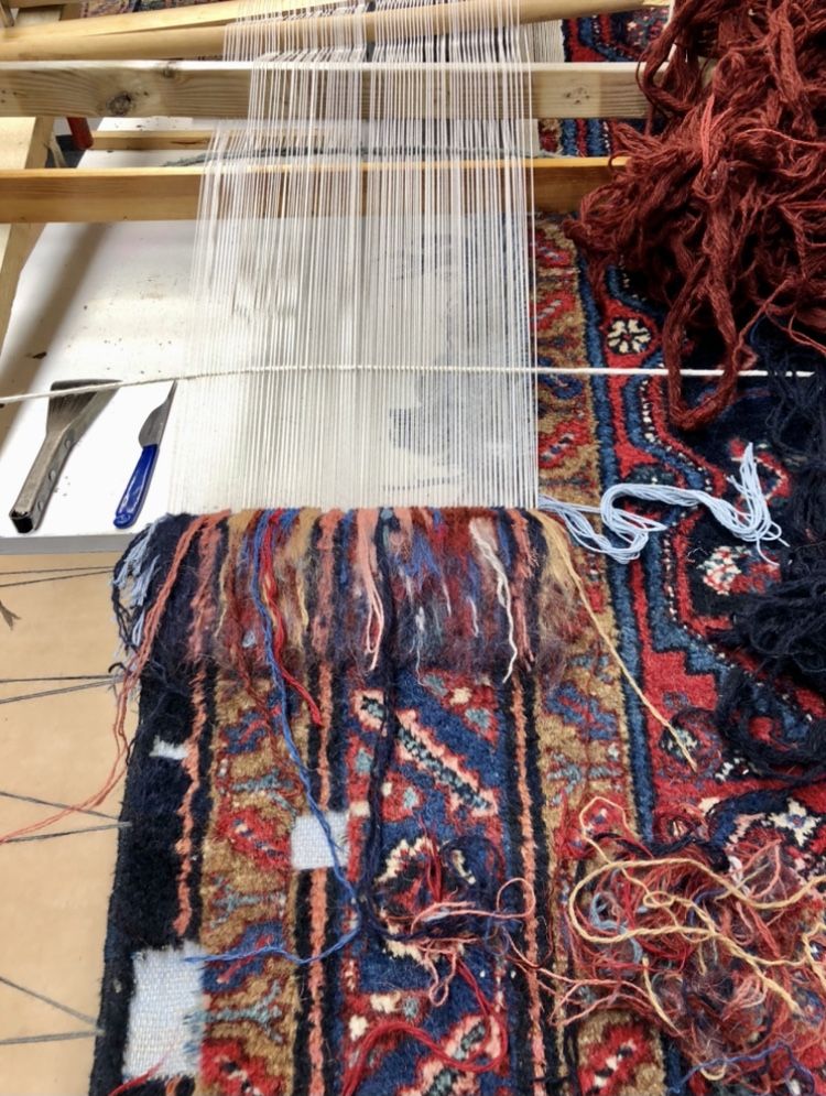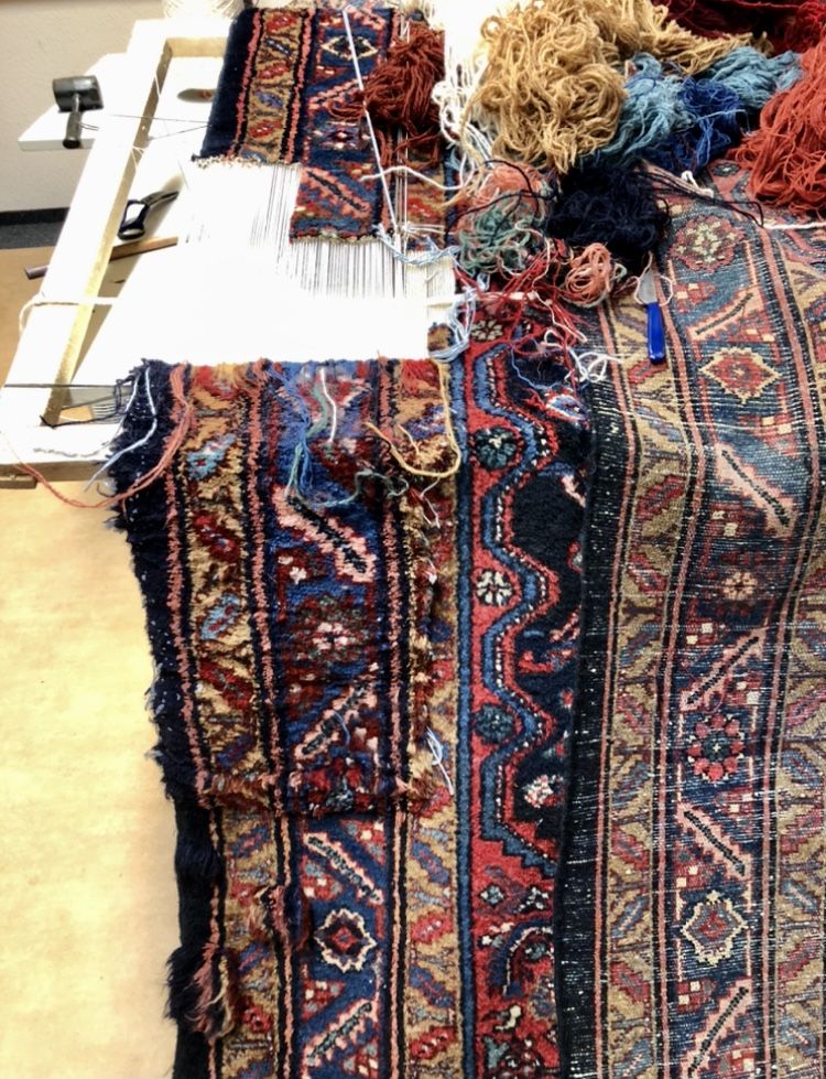 Ausgebrannte Stellen werden ausgeknüpft und mit passender Wolle originalgetreu ersetzt. So bleibt der Schaden nahezu unsichtbar.